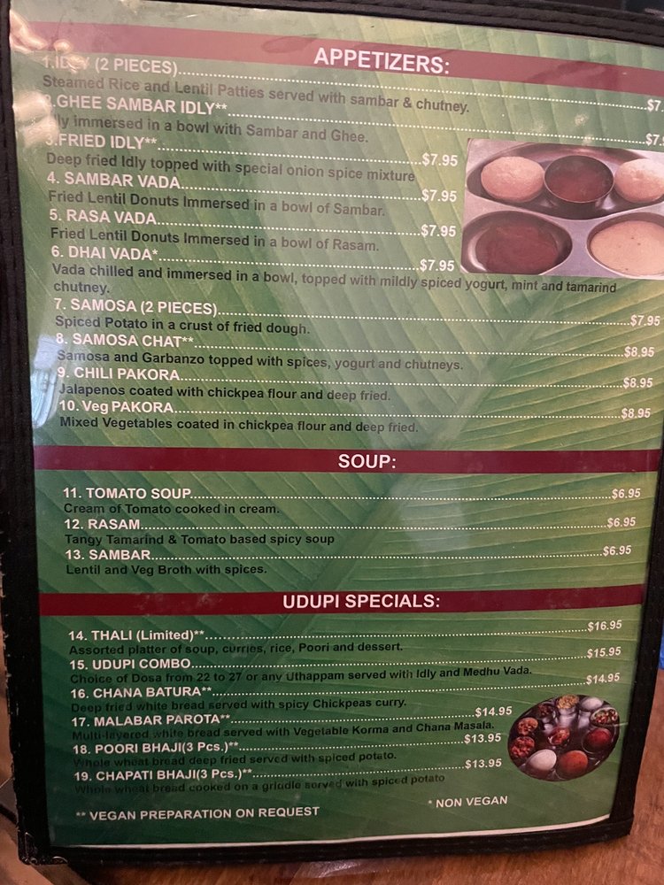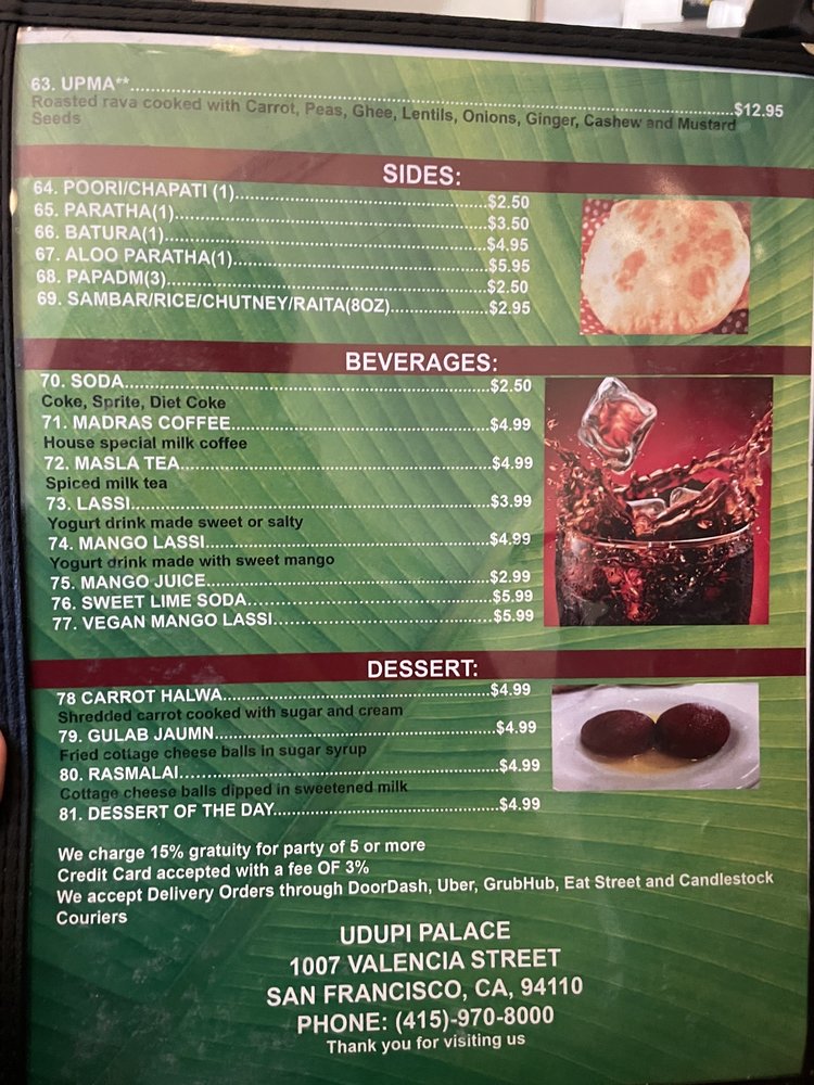 Introducing Udupi Palace, a vegetarian and vegan Indian restaurant in San Francisco known for its extensive dosa menu. Specializing in South Indian cuisine, Udupi Palace offers a variety of dosas, thalis, idlis, and vadas. Customers rave about the delicious flavors and generous portions of dishes like the Special Rava Masala Dosa and Udupi Combo. The restaurant's casual and welcoming ambiance, along with friendly service, makes it a popular choice for a casual dining experience. With options for delivery, takeout, and catering, Udupi Palace caters to a wide range of needs. Don't miss out on the authentic South Indian flavors and comforting dishes at Udupi Palace on Valencia Street.